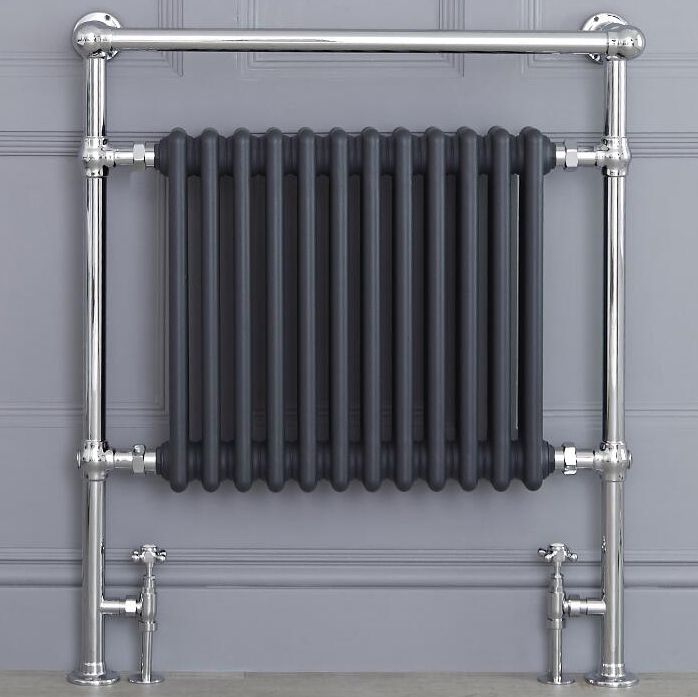 Combining traditional design with modern heating functionality, this hot water towel radiator features a chrome and anthracite finish for an eye-catching look. It has an overhanging top rail, giving you room for keeping towels warm and dry, as well as neat and tidy.